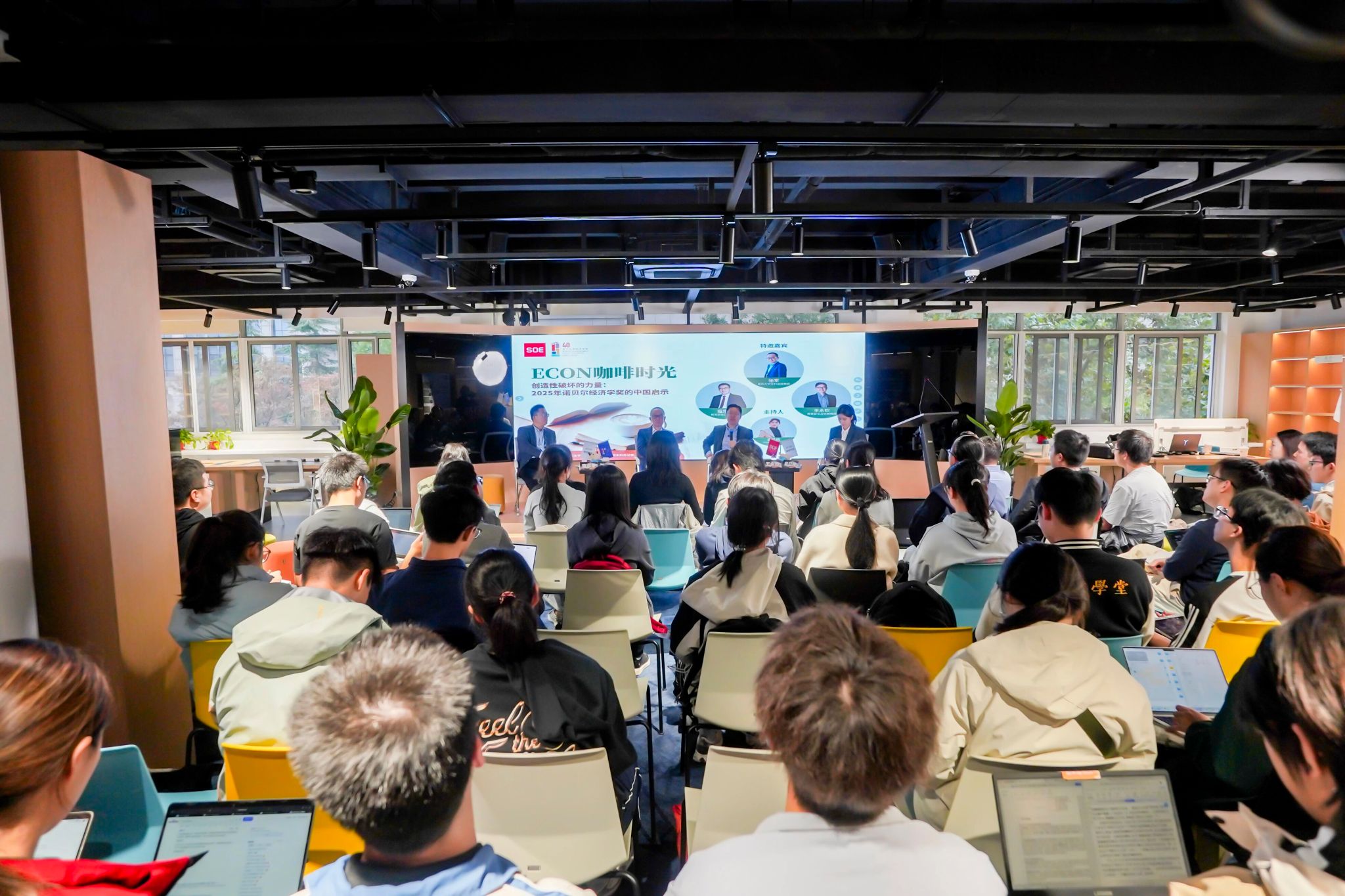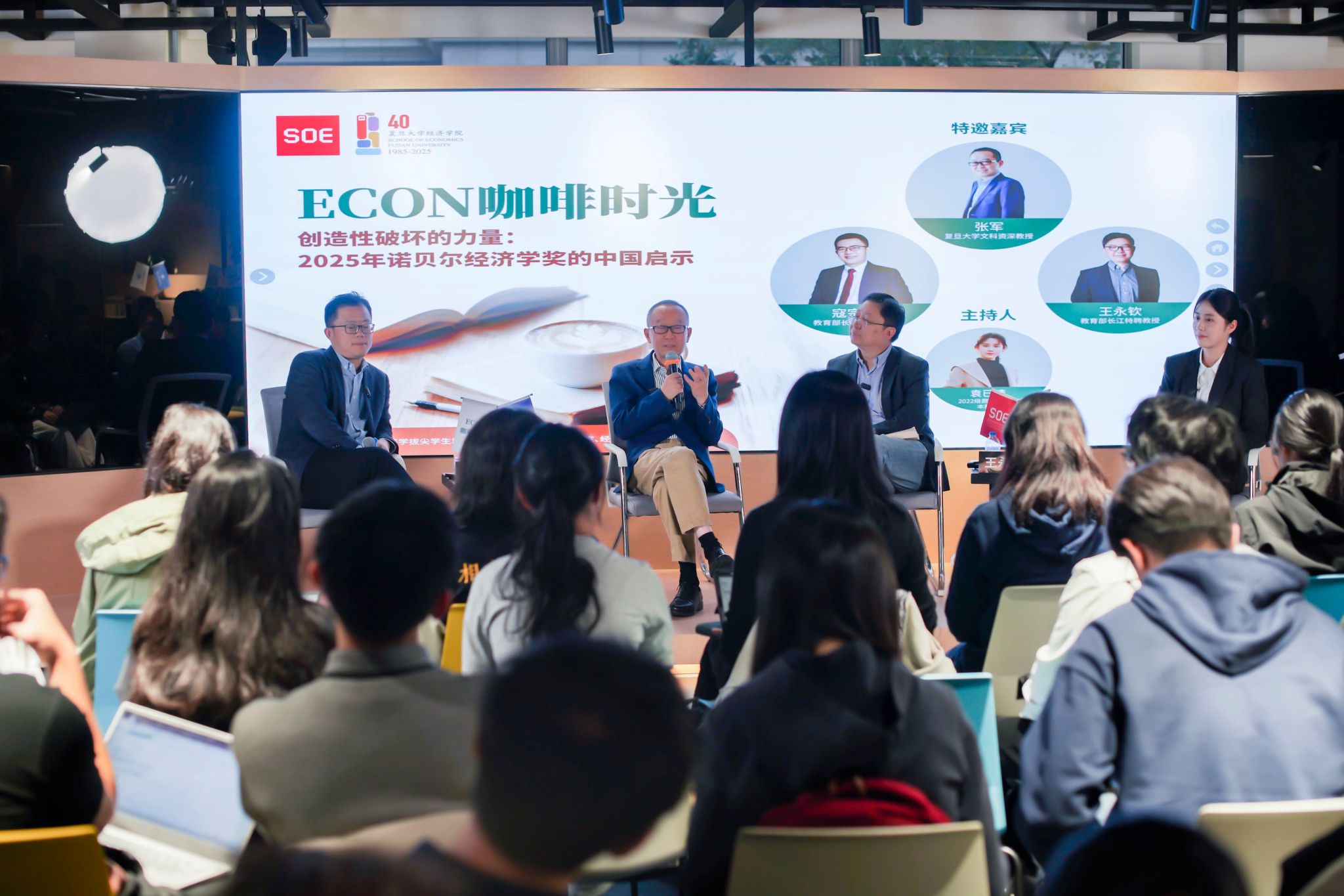 副院长寇宗来,国家级人才、复旦金融研究院执行院长王永钦三位重磅嘉宾,围绕“大分流与李约瑟之谜”“创造性破坏的思想源流”“从中国制造到中国创造”“青年学子的时代使命与人生定位”四大核心议题,与在场学子展开层层递进的思想碰撞,既不乏学术深度,又兼具现实观照,为大家呈现了一场兼具理论厚度与实践启发的学术盛宴。本次活动由2022级经济学(数理经济方向)专业本科生袁已晴同学主持。