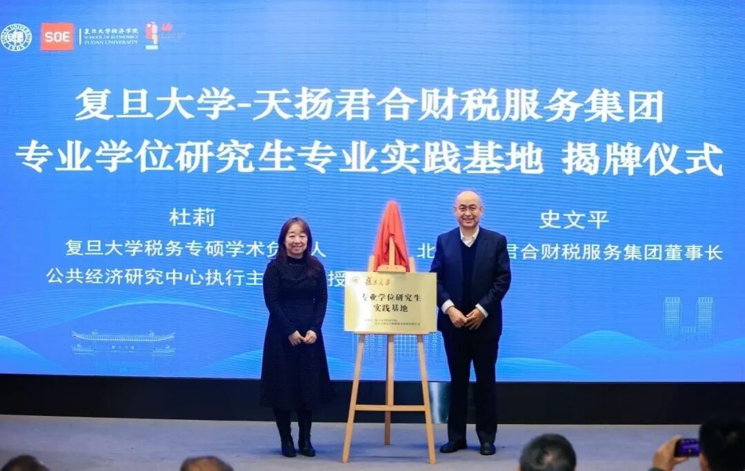 ——北京天扬君合财税服务集团专业学位研究生专业实践基地”揭牌仪式,标志着复旦税务硕士项目在校企协同育人方面迈入新阶段。