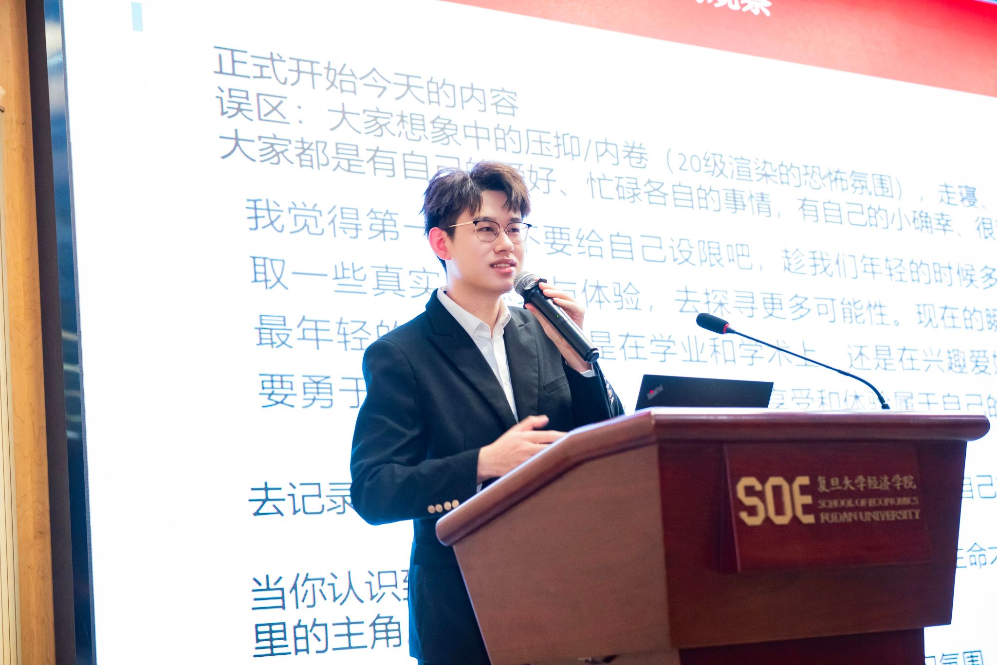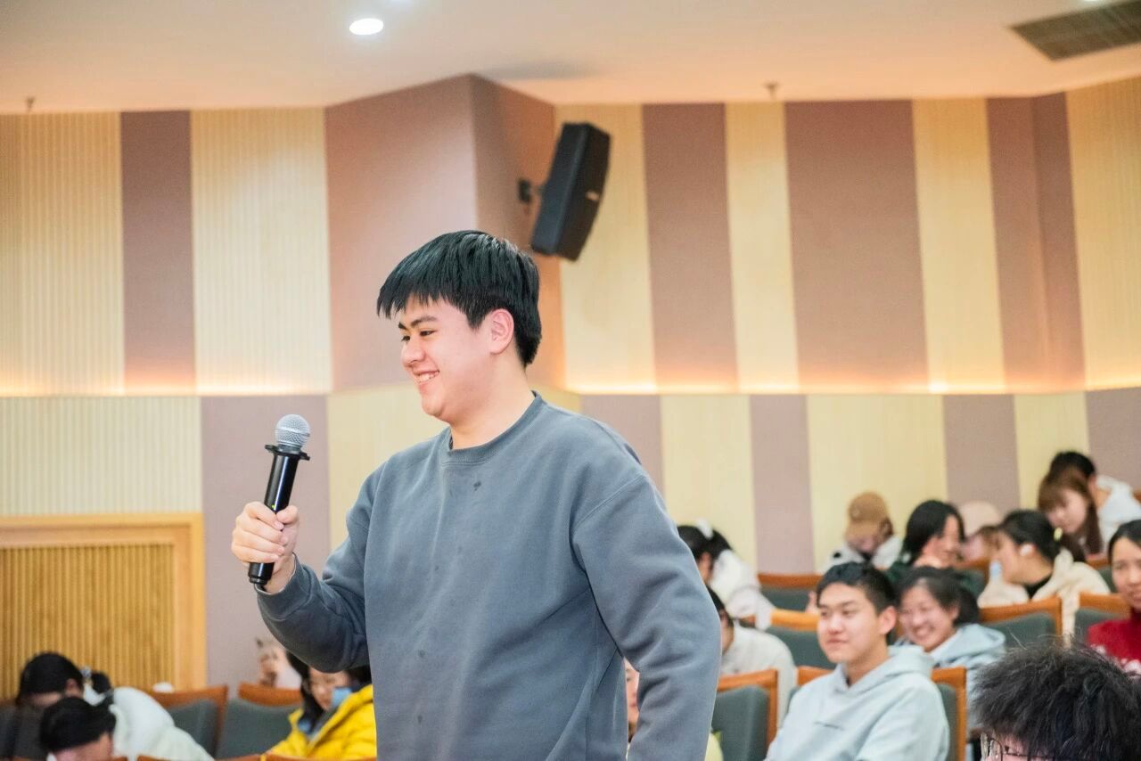 专业硕士吴尚恒同学以“金融专业的奇幻漂流——本科学习生活分享”为题,分享了自己在国际金融系四年的学习生活体验。吴尚恒以自身经历生动诠释了金融学子的多元发展可能:他不仅是学业上的佼佼者——曾获国家奖学金、绩点综评第一,更在学生工作、创新创业与文艺活动中全面发展,曾担任班长、社团社长,获得全国商赛总冠军、校十大歌手亚军等荣誉。他表示,金融系班级历来是非常活跃的群体,在这里与优秀者通行,可以接触和分享非常前沿的动态,对业界与市场认知最为敏感与深刻;班级同学大多能平衡学业与个人爱好,生活丰富多彩,建议学弟学妹不要给自我设限,多尝试不同方向。
