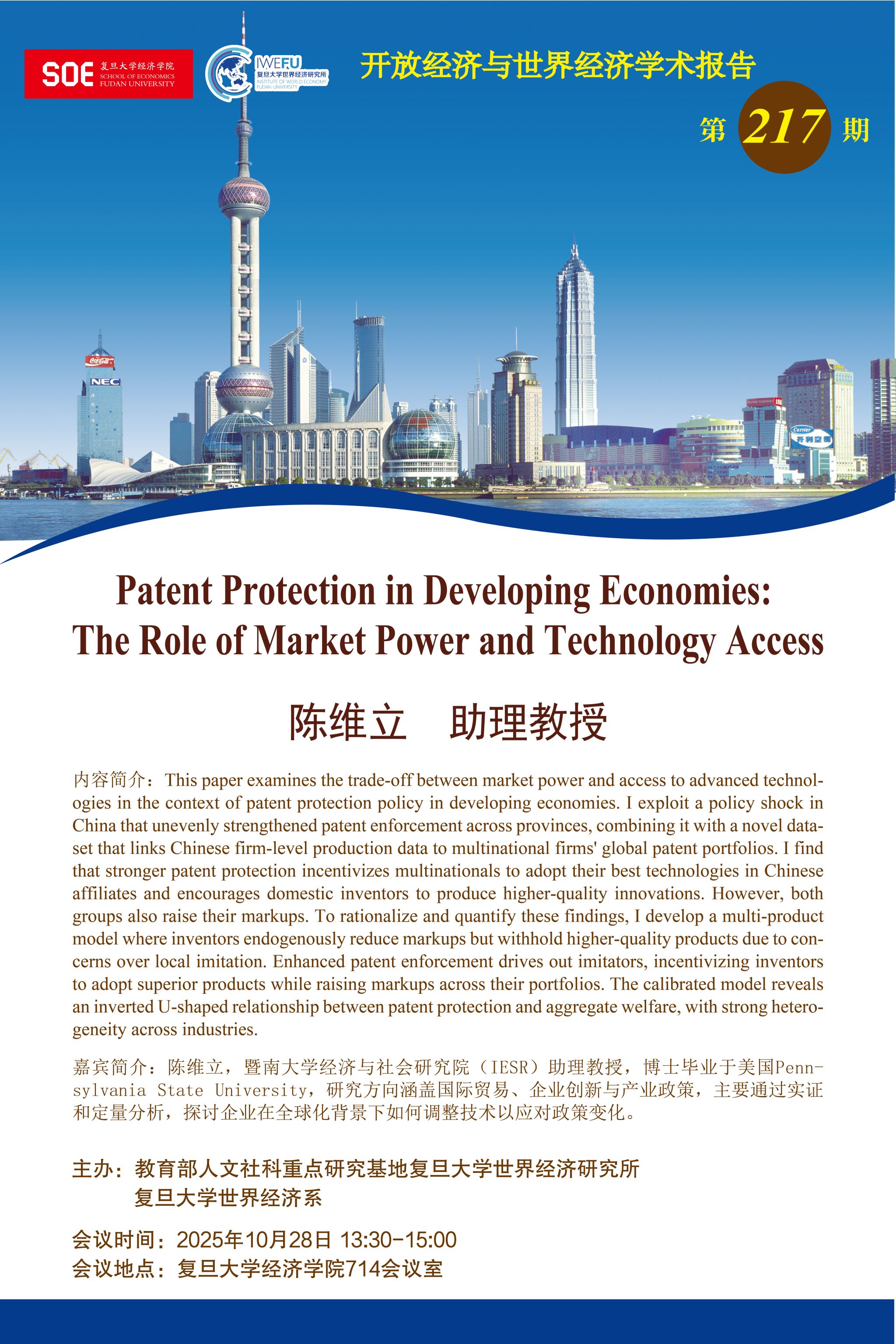 福利姬 世界经济研究所开放经济与世界经济学术报告第217期:Patent Protection in Developing Economies: The Role of Market Power and Technology Access