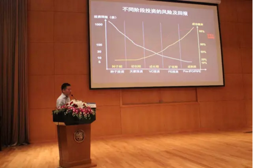 紧接着,蒋水冰先生切入主题,先从私募股权投资的概念出发,介绍种子投资、天使投资、风险投资、创业投资、股权投紫、上市前投资、上市公司定增等不同的投资类型。对于大家比较感兴趣的收益回报和风险问题,蒋水冰先生以一张生动形象的图表,展示了公司在种子期、初创期、成长期、扩张期、成熟期不同阶段投资类型的风险及回报,并以腾讯、阿里巴巴、嘀嘀打车等收益超过10000倍的典型案例,说明了私募股权投资尤其是投资回报可达1000倍的种子期收益回报是相当高的。