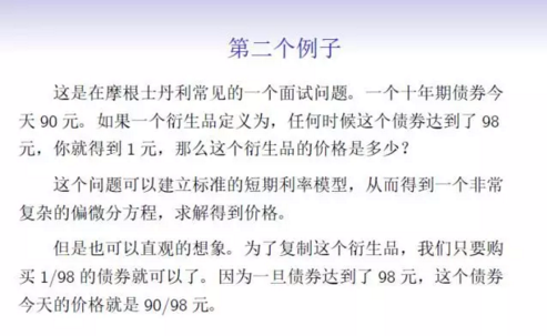 之后,孙健教授又举了第二个例子——摩根士丹利的一个常见面试问题:一个十年期债券今天90元,如果一个衍生品定义为:任何时候这个债券达到了98元,你就得到1元,那么这个衍生品的价格是多少?孙健教授给出了一个跳出了常规思路、站在直观角度上的简单答案,带给了营员们巨大的启发——我们需要加强对市场和衍生品的理解与直觉,量化金融需要量化思维和市场直觉的有效结合。
