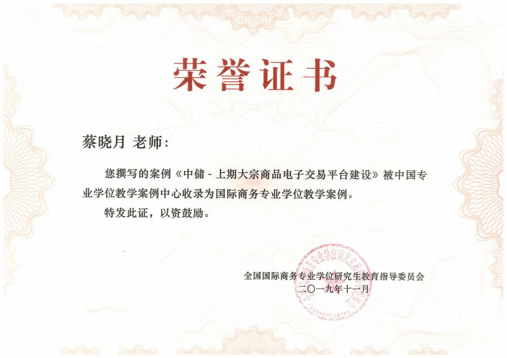 2019年11月9日上午,从全国国际商务专业学位研究生教育工作会议传出喜讯。蔡晓月老师撰写的《中储——上期大宗商品电子交易平台建设》作为国际商务案例在中国专业学位教学案例中心成功入库(全国总共15篇)。