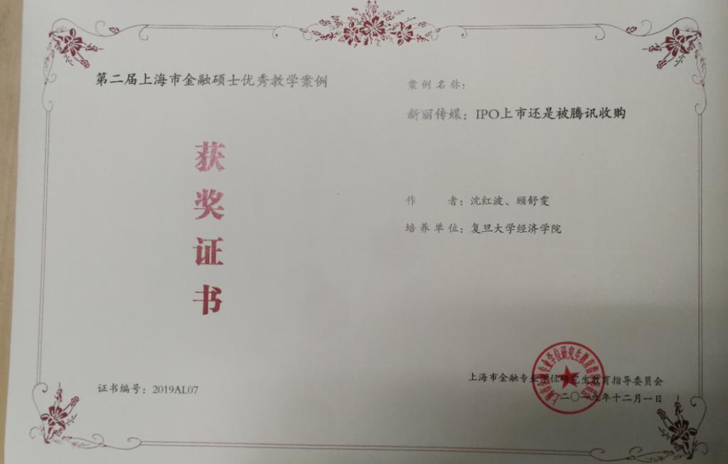 2019年12月1日上午,从上海市金融专业学位研究生教育工作会议上传出喜讯:沈红波副教授、顾舒雯同学撰写的《新丽传媒:IPO上市还是被腾讯收购》在第二届上海市金融硕士优秀教学案例评选中荣获优秀案例奖。