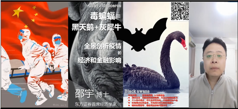 邵宇博士发表了题为“新冠=黑天鹅+灰犀牛 2020=1918+1929+2008?!”的主题报告。邵先生从疫情发展轨迹、经济政策效力和金融市场波动三个方面对新冠疫情的影响作出解读。邵先生认为,本次病毒致死率高于普通流感,传染率高于SARS,且隐蔽性非常强,这导致了防控的困难。全球经济衰退难以避免,造成的冲击程度会超过2008年金融危机。财政政策和货币政策会成为本次应对危机的重要工具,但就目前来看,这种政策刺激可以在短期内托住金融市场,却难以托住经济。最后,邵宇先生提出了疫情对于中国中长期影响需考虑“大国博弈”、“新一轮产业革命”、“全球供应链冲击”等多方面的因素。
