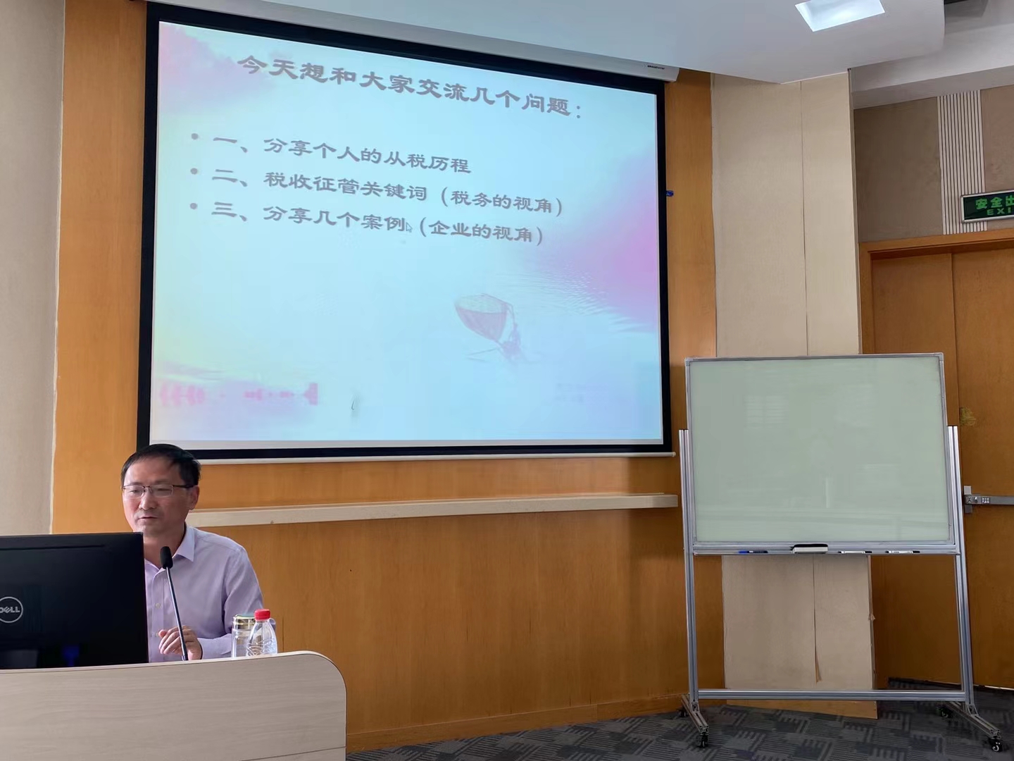 讲座开始,王老师简要分享了个人的从税经历和心路历程,从初入国税系统到成为局长再到成为企业高管,王老师在一个个税案中不断学习和思考,积累了丰富的经验和感悟,并充分运用到实际工作中,让同学们感受到了一位才识与情怀并存的前辈的高度与温度。