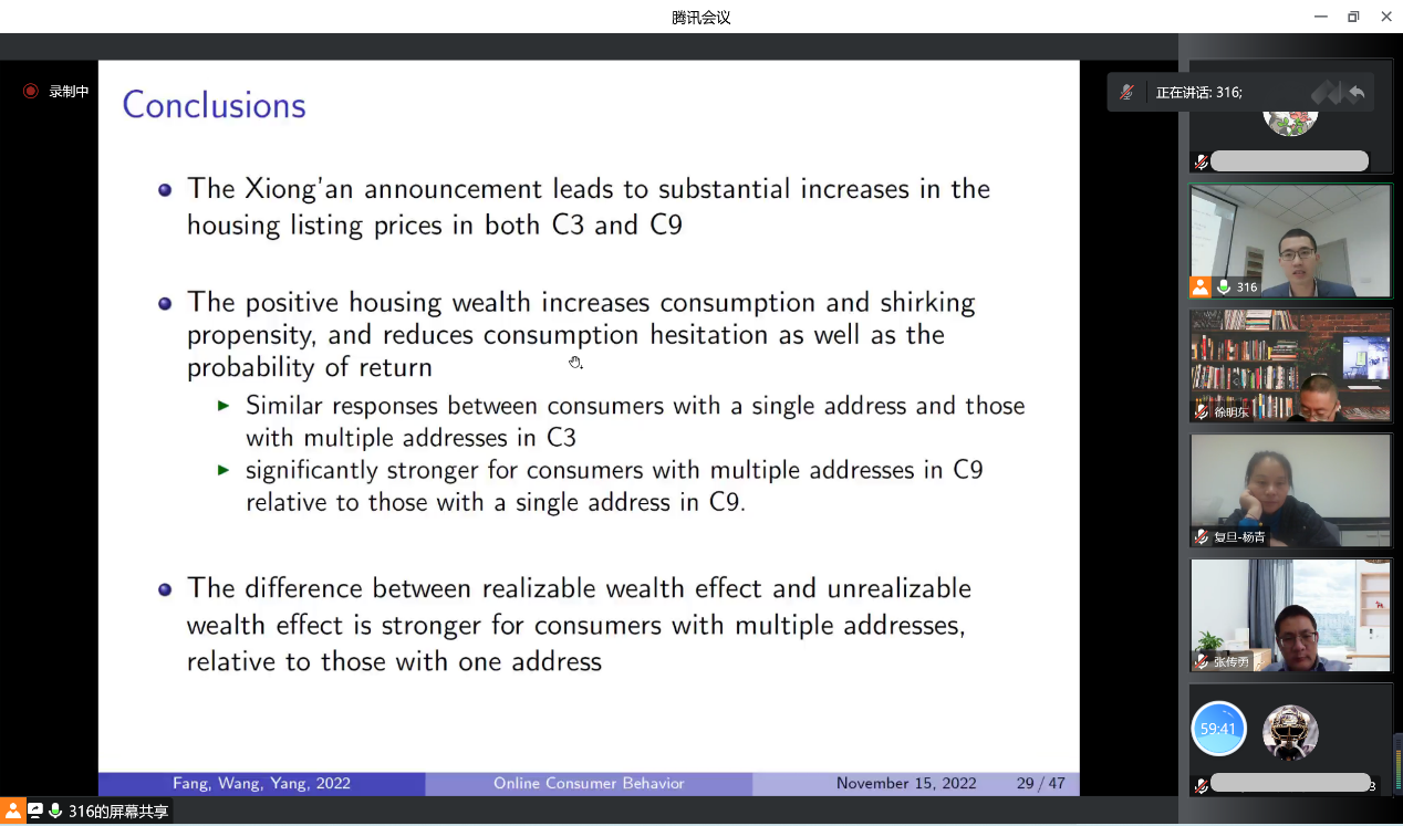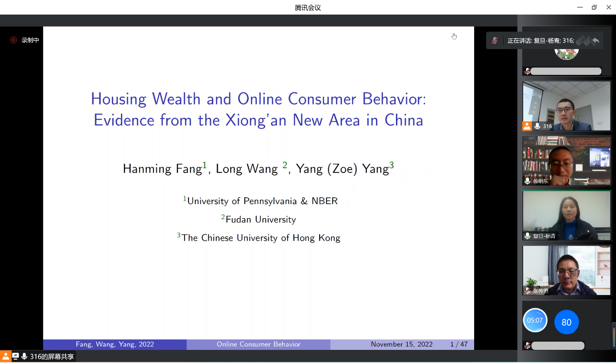 助理教授王龙老师带来了主题为“房产财富和消费行为:来自中国雄安新区的证据”的分享,本次讲座由福利姬