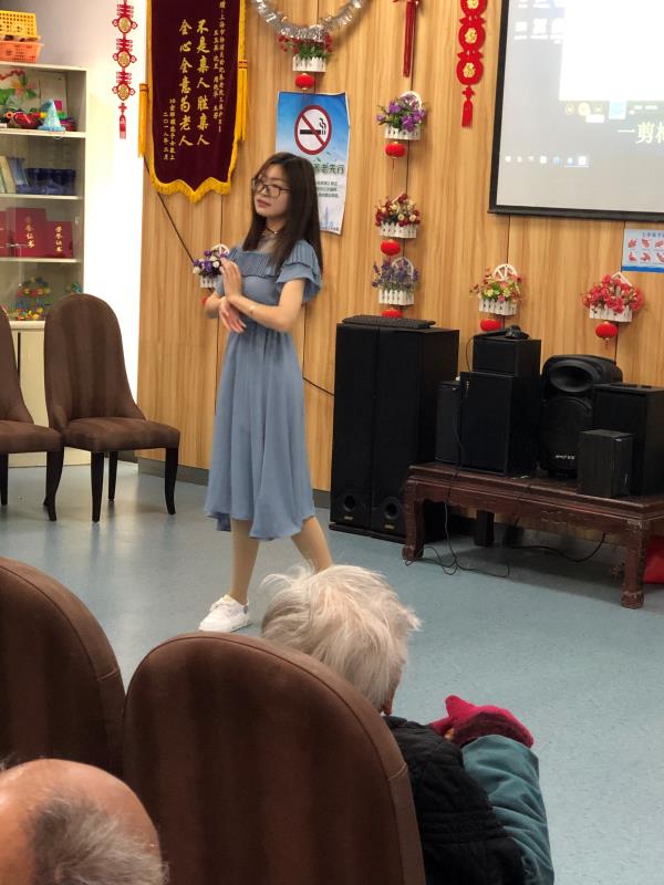 上午9:10,十位志愿者组成志愿者团队,在南区食堂门口集合,一同出发前往世纪养老院。复旦的志愿者已经是世纪养老院的常客了,这一次他们给老人们带来各式的节目,老人们聚在一起,共同欣赏志愿者们的表演。