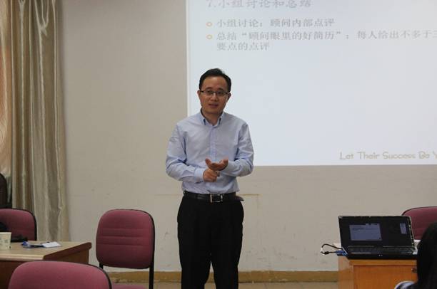 13:30,课程准时在叶耀珍楼302开始。首先是顾问黄杰为我们讲授关于简历制作的相关问题。内容涵盖了简历的功能、关键词、写作原则、写作准备以及简历的投递与维护。黄杰顾问尤其提到,一份好的简历首先应该版式清晰美观,让人一目了然;同时又应该在简历中精心设计亮点,特别是能展现自己优势特长的经历和自身与所投递公司要求相符合的特点。之后,黄杰顾问和其他几位顾问又一一回答和讲解了同学们一直以来感到困惑的一些问题,比如简历上要不要放照片以及照片的要求,简历投递的时机与注意事项等。