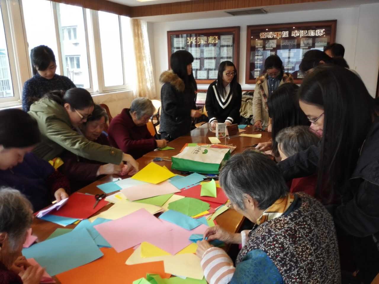 本次活动有13名志愿者参加。到达福利院后志愿者们联系了社区福利院的负责人郭欢欢女士,得知下午老人们恰好上手工课,于是志愿者们主动承担帮助手工课老师协助老人完成折纸课程的任务。志愿者们分为了两个组,一个组和老人折虎头鞋,另一个组陪伴老人折蝴蝶和花朵。