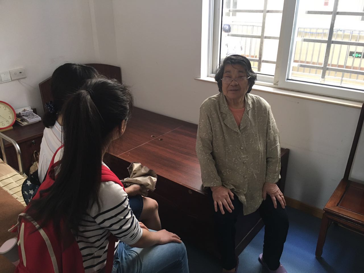 养老院从外面看只是一栋简单的小楼,但里面的设施非常齐全。到达养老院一楼大厅后,在领队张毅凡同学的引导下,12位学员平均分成三组,分别负责二、三、四楼的慰问。由于天气很好,阳光明媚,所以有许多老人出来散散步晒晒太阳。四楼每个房间有1到2位老人,老人们的身体都很硬朗,尽管大都已经八十甚至九十高龄,思维却依然活跃。老人们非常热情地招呼学员们进来坐下,饶有兴趣地讲起他们的故事。其中一位老奶奶讲述了她年轻时从芜湖到上海打拼,老了之后又和儿女到各国旅游的故事,交谈近半小时丝毫不见疲乏,学员们也深受触动,感慨颇多。