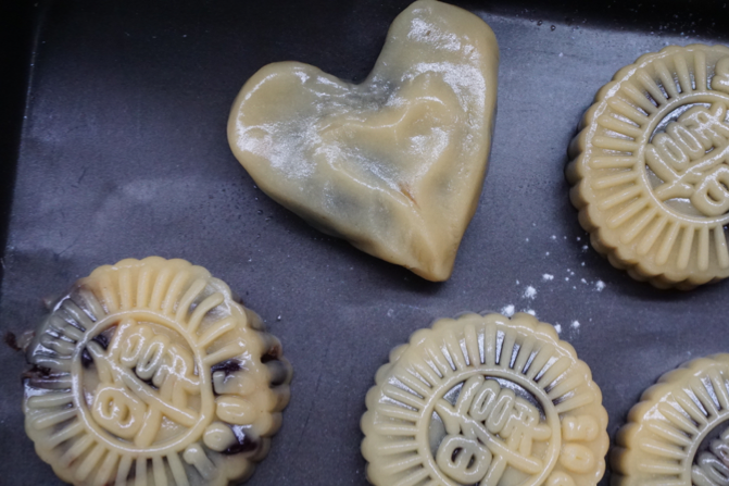 但所谓“熟能生巧”,没过多久,同学们便已初步摸索出了一些小诀窍,手下的动作自然也就加快许多。一旁的托盘上,卧上了一排排金黄的月饼。不过此时,同学们已经有些不满足于单一传统的豆沙馅料。一些“特别”配料终于派上了用场。辣条、QQ糖……五花八门的搞怪馅料层出不穷。不仅如此,同学们还在月饼的外形上别出心裁,做出了爱心、猫形、金字塔形等等形状,还有令人爱不释手的袖珍小月饼。食堂的师傅在细细打量了一番这诸多作品后,也不禁叹服于同学们的想象和创意。
