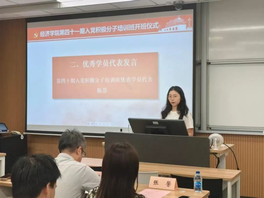 第四十期入党积极分子培训班优秀学员代表陈慧同学分享了她在上期培训班学习过程中的深刻感悟:通过《习近平经济思想》《党的指导思想和纲领》等课程夯实了理论基础,结合两会报告与改革开放历史进程深化了对党员信仰和使命的理解,认识到青年应胸怀“经世济民”之志,传承红色血脉,发挥先锋模范作用,在新时代背景下将个人理想融入中国式现代化建设,积极投身国家高质量发展浪潮,以实际行动向党组织靠拢,展现青年担当。
