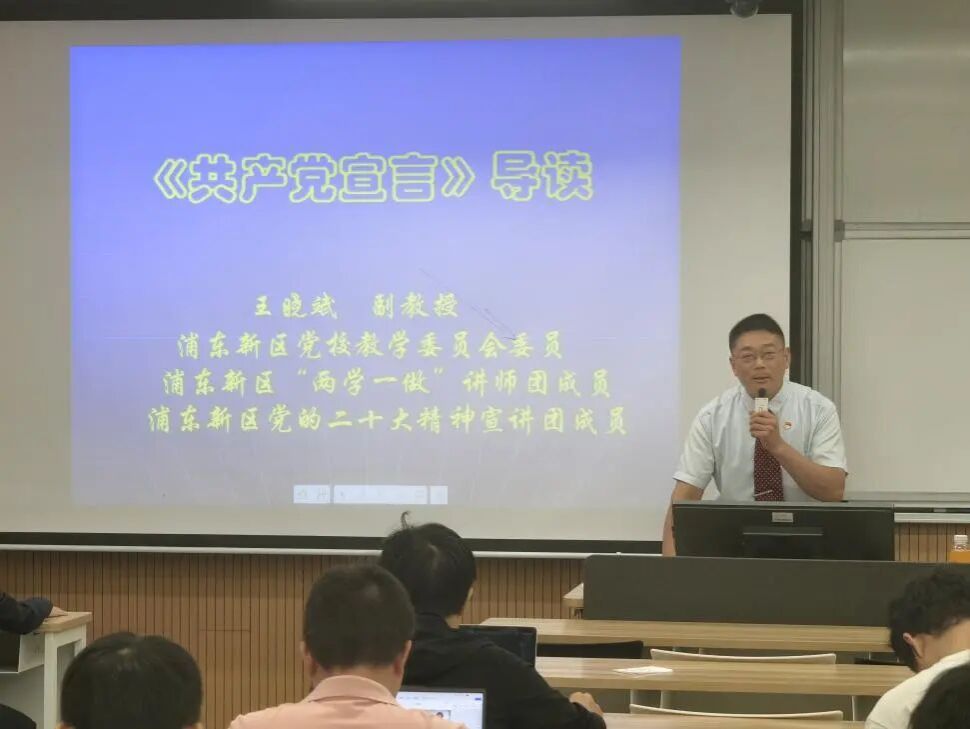 浦东新区党校教学委员会委员、浦东新区“两学一做”讲师团成员、浦东新区党的二十大精神宣讲团成员王晓斌副教授带领学员们深刻解读了《共产党宣言》(以下简称《宣言》)。王老师首先总结并高度评价了刚才各小组的汇报成果。他从《宣言》诞生的历史背景讲起,结合中国共产党领导中国人民进行革命、建设与改革的伟大实践,系统详细地为同学们分析了《宣言》的主要观点与论证逻辑,阐释了马克思主义与时俱进的理论品格。最后王老师对同学们寄予厚望,鼓励同学们加强理论学习,踊跃投身中国特色社会主义伟大实践,为建设社会主义现代化强国,实现中华民族伟大复兴的中国梦贡献青年力量。
