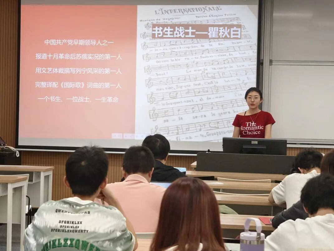 国史宣讲团的王涵玉老师从上海的红色地标入手,带领同学们学习党在上海的发展历程,领略党的传奇历史。王老师引导同学们代入我党早期主要领导人、无产阶级革命家瞿秋白烈士的视角,并以他的革命人生为线索,向同学们详细讲解了上海大学(旧址)、党的四大会址、中共中央政治局机关(旧址)、左翼作家联盟会址纪念馆、瞿秋白故居等上海重要红色地标,介绍了瞿秋白作为革命家与文学家的心路历程,讲述了革命时代上海的风云变幻与沧桑巨变。同学们从王老师别出心裁的新颖讲解中,更加深入地了解了自己身边的红色地标,也对以瞿秋白为代表的革命先烈们一心为国、无惧牺牲的伟大精神有了更切身的体会。