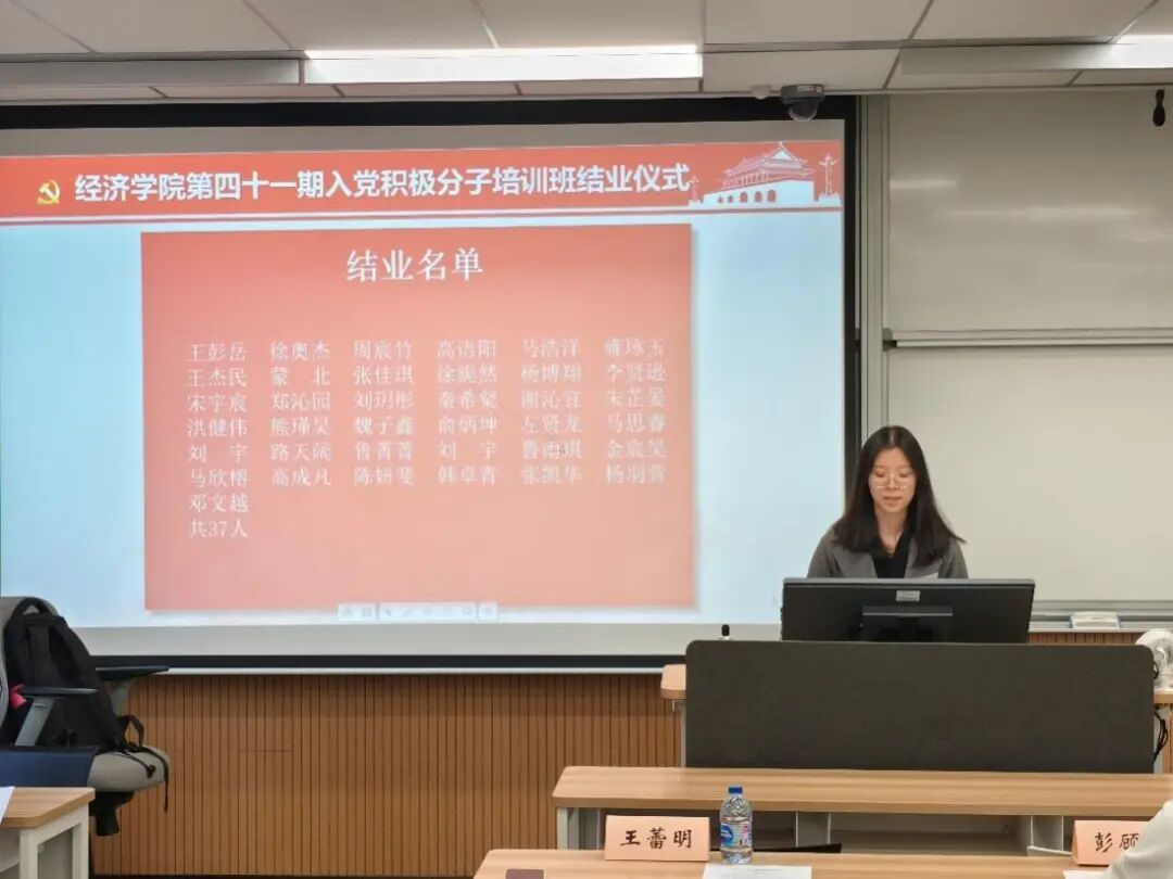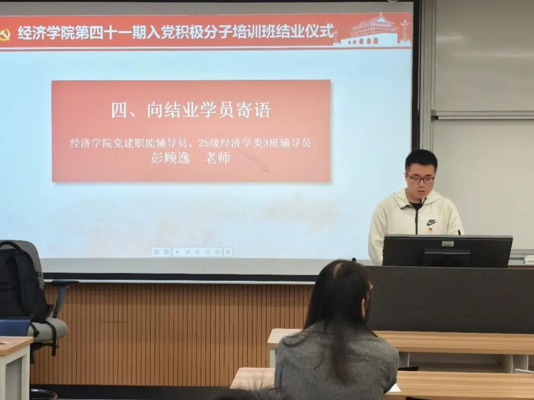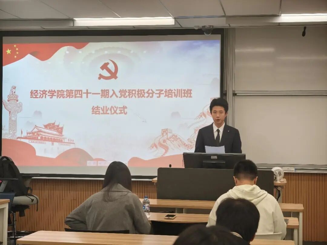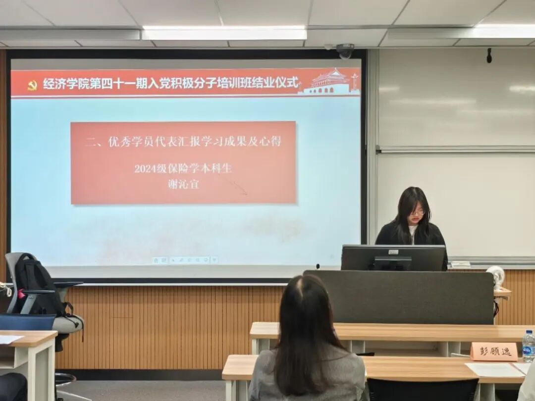 随后,本期培训班优秀学员代表谢沁宜同学进行了发言,分享了她参加培训班的学习收获与感悟。她表示自己通过专家理论授课、红色实践参访和小组研讨交流深刻领悟了党的初心使命与理论创新,坚定了“为人民服务”的理想信念,并结合经济学科特色强调新时代青年应肩负“经世济民”的责任担当。她以“功成不必在我,功成必定有我”的精神自勉,承诺将继续以党员标准严格要求自己,将培训所学转化为服务国家发展的实际行动,争取早日成为一名合格的共产党员。